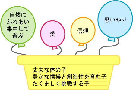 | 集団生活の中で、子どもの個性を尊重し自発性、自立性、協調性を養い、子どもが豊かな人間性を培う基礎を養う。 |